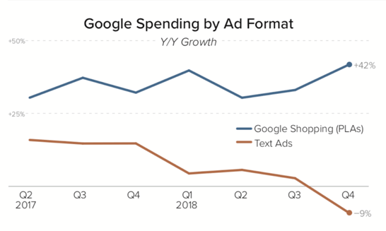 Most paid search experts believe Google Shopping is a big opportunity for online retailers and it will continue to play an important role in years to come. According to Merkle’s Digital Marketing Report for Q4 2018, while text ad spending fell 9% Y/Y following three quarters of single-digit growth, spending on Google Shopping ads grew 42% Y/Y in Q4 2018. This was the highest growth rate for Google Shopping spend since mid-2016. For retailers, Google Shopping ads accounted for 63% of all Google search ad clicks–an all-time high as well.